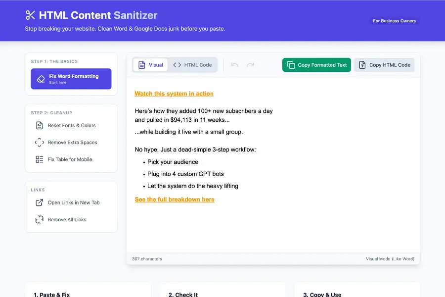 Clean messy HTML copied from emails, websites, or editors. Strip unwanted tags and keep only clean, usable content.